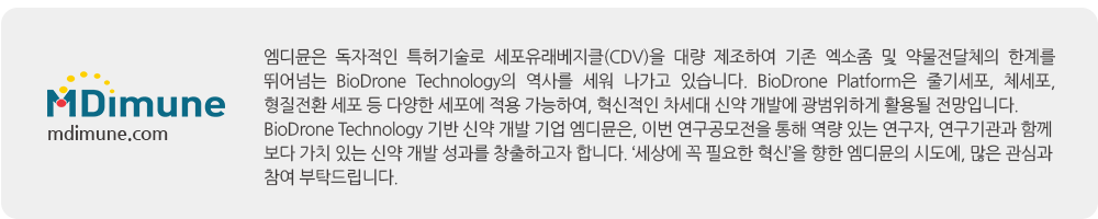 ◈ 세부주제: BioDrone 봉입 전략 및 기술, BioDrone 표적화 전략 및 기술, 그 외 BioDrone 적용 및 활용 가능 기술 및 대상 * 해당 세부 주제항목 외에도 BioDrone 플랫폼의 가치를 높일 수 있는 기술 및 전략에 대하여 신청에 제한을 두지 아니함. 자세한 내용은 엠디뮨 홈페이지 내 공고문(RFP) 참고 및 문의.