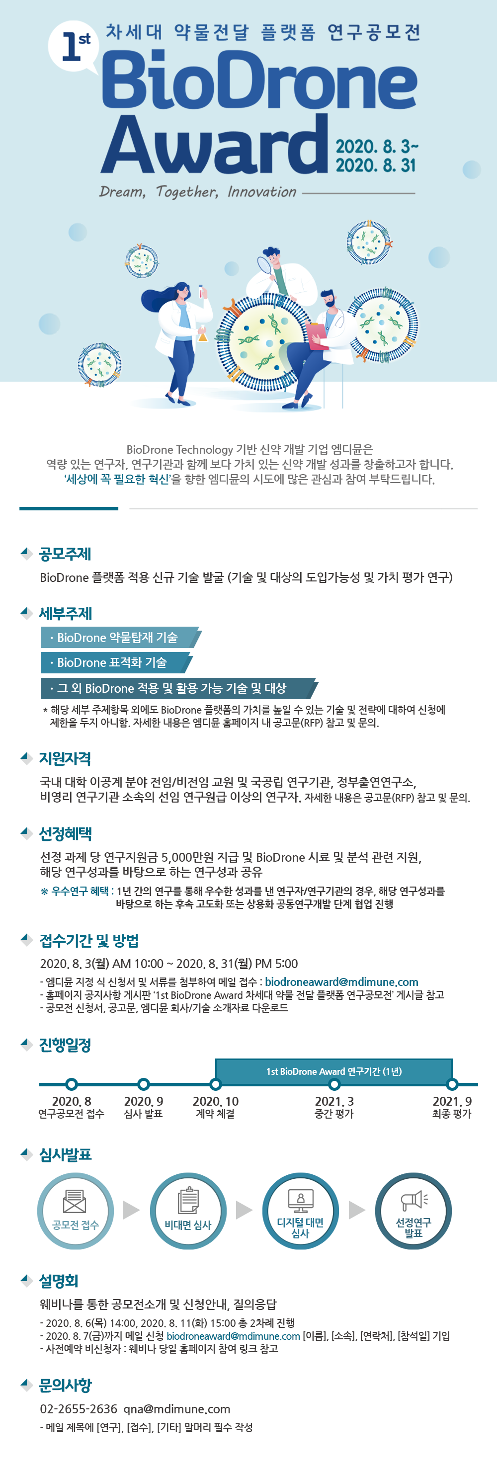 ◈ 접수기간 및 방법 : 2020. 8. 3(월) AM 10:00 ~ 2020. 8. 31(월) PM 5:00 - 엠디뮨 지정 식 신청서 및 서류를 첨부하여 메일 접수 : biodroneaward@mdimune.com - 홈페이지 공지사항 게시판 ‘1st BioDrone Award 차세대 약물 전달 플랫폼 연구공모전’ 게시글 참고 - 공모전 신청서, 공고문, 엠디뮨 회사/기술 소개자료 다운로드