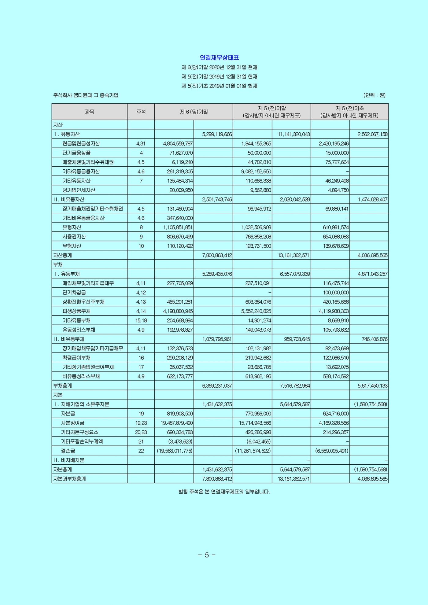 감사의견 : 우리는 주식회사 엠디뮨과 그 종속기업들의 연결재무제표를 감사하였습니다. 우리의 의견으로는 별첨된 연결회사의 연결재무제표는 회사의 2020년 12월 31일 현재의 연결재무상태와 동일로 종료되는 보고기간의 연결재무성과 및 연결현금흐름을 한국채택국제회계기준에 따라, 중요성의 관점에서 공정하게 표시하고 있습니다.