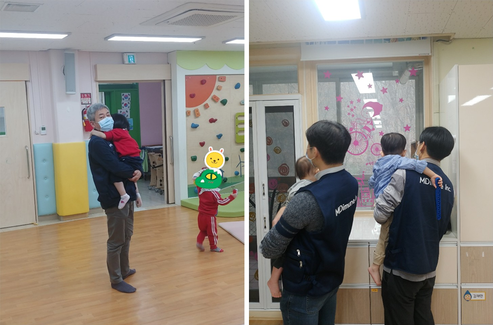 엠디뮨 임직원들 모두 함께 '초록우산어린이재단 한사랑장애영아원'에 봉사활동 및 ’나눔실천펀드‘를 통한 기부를 진행하였습니다. ‘한사랑장애영아원’은 시설 보호가 필요한 장애영유아들에게 가정식 주거공간을 지원합니다 가정생활과 의료, 재활치료, 교육, 훈련 등 개인별 맞춤서비스 지원을 통해 아동 개인의 능력을 최대한 성장시키고 조기재활에 주력하여 사회통합을 목적으로 하는 장애영유아들의 권리를 찾아주는 보금자리 입니다. 아이들과 오랜시간을 함께 할 수는 없었지만, 아이들이 맛있게 먹고 밝게 웃는 모습을 보면서 오히려 엠디뮨 직원들이 더 행복을 느끼는 따뜻한 시간이 였습니다. 이번 봉사활동이 ‘한사랑장애영아원’의 어린이들과 모든분들께 기쁨과 행복한 마음이 전달되었기를 바라며, 아이들이 건강하고 행복하게 잘 자라길 응원합니다.