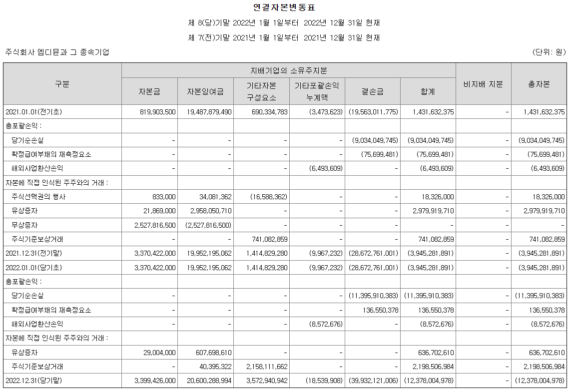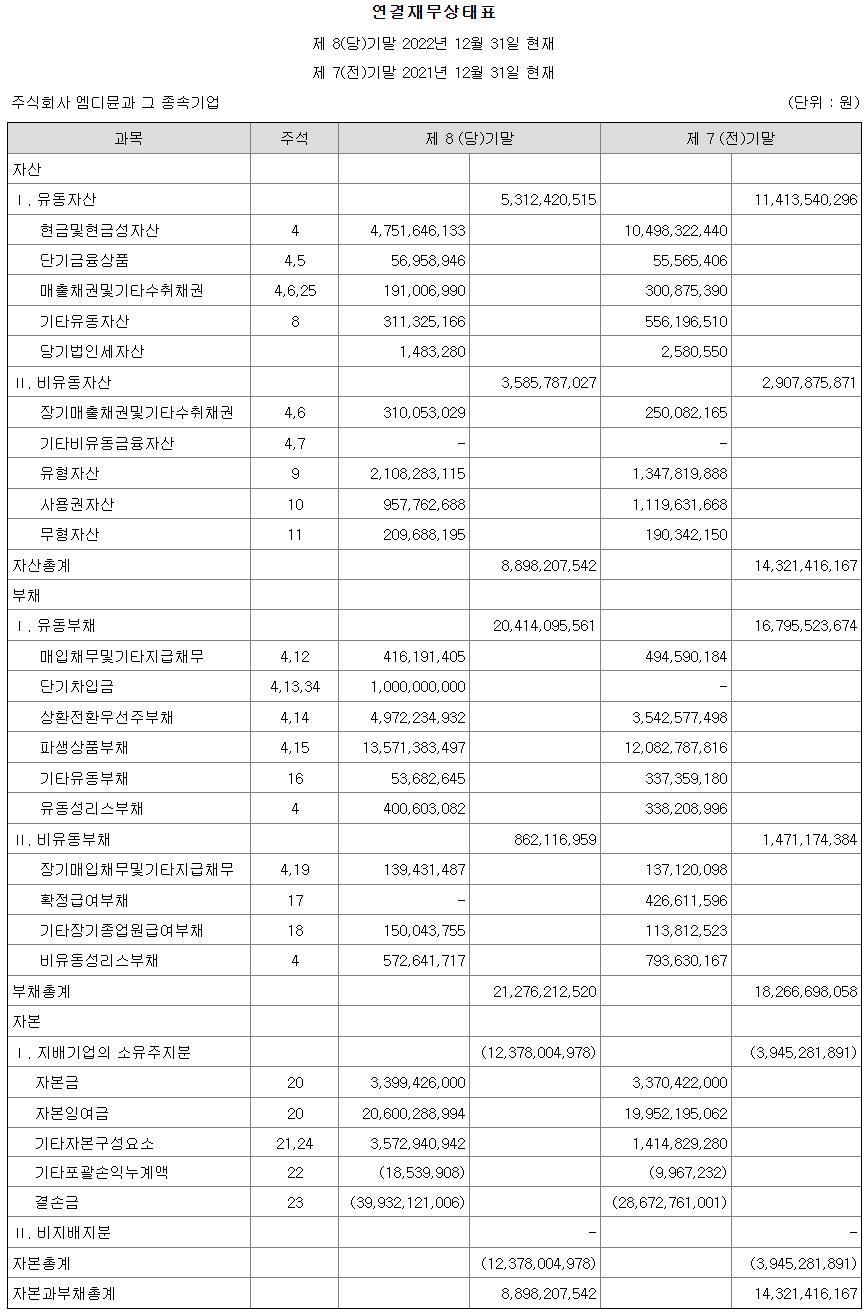 감사의견 : 우리는 주식회사 엠디뮨과 그 종속기업들의 연결재무제표를 감사하였습니다. 우리의 의견으로는 별첨된 연결회사의 연결재무제표는 회사의 2022년 12월 31일 및 2021년 12월 31일 현재의 연결재무상태와 동일로 종료되는 양 보고기간의 연결재무성과 및 연결현금흐름을 한국채택국제회계기준에 따라, 중요성의 관점에서 공정하게 표시하고 있습니다.