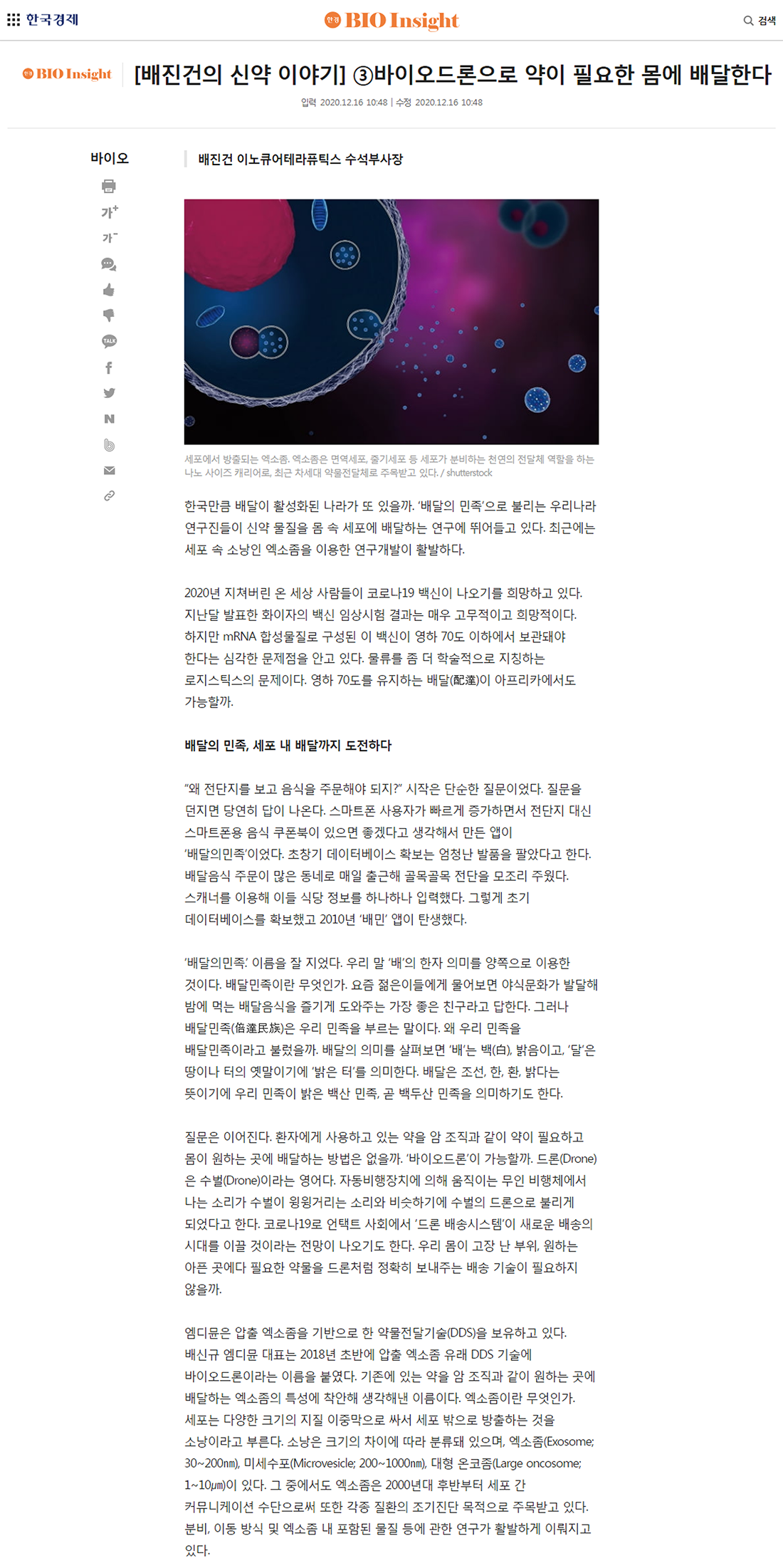 한국만큼 배달이 활성화된 나라가 또 있을까. '배달의 민족'으로 불리는 우리나라 연구진들이 신약 물질을 몸 속 세포에 배달하는 연구에 뛰어들고 있다. 최근에는 세포 속 소낭인 엑소좀을 이용